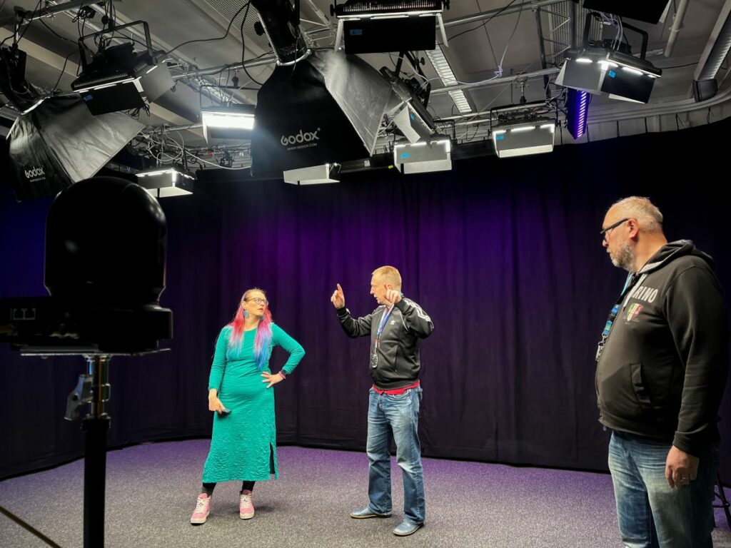 Valmistautuminen helpottaa esiintymistä. Haaga-Helian AV-asiantuntijat Heikki Yli-Ketola (oik.) ja Joona Meriläinen opastavat Anni-Veeraa studiossa.