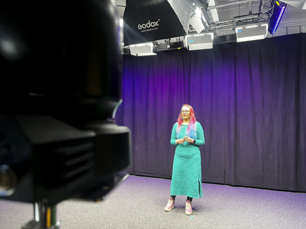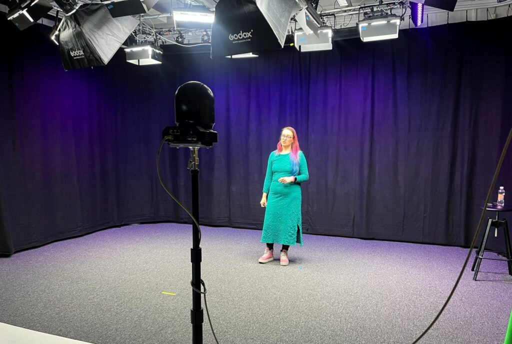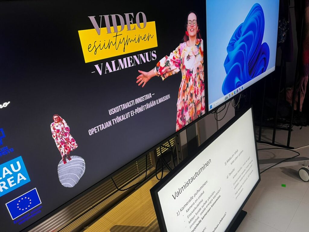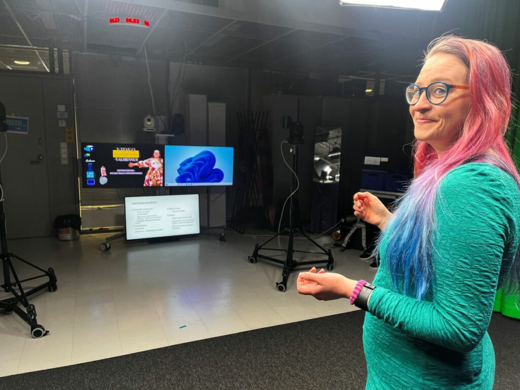 Aitolehti on aidossa tilanteessa – hän seisoo yksin videokameran edessä Haaga-Helia Ammattikorkeakoulun suuressa studiossa. Kurssilaiset ovat ruutujen takana, sillä menossa on suora livestream EduMedia-hankkeen Kehitä pedagogisen median taitojasi -koulutuksessa. Siihen osallistuu korkeakoulujen henkilöstöä Haaga-Helia Ammattikorkeakoulusta, Laurea-ammattikorkeakoulusta ja Oulun yliopistosta, ja he seuraavat lähetystä omilla kampuksillaan.