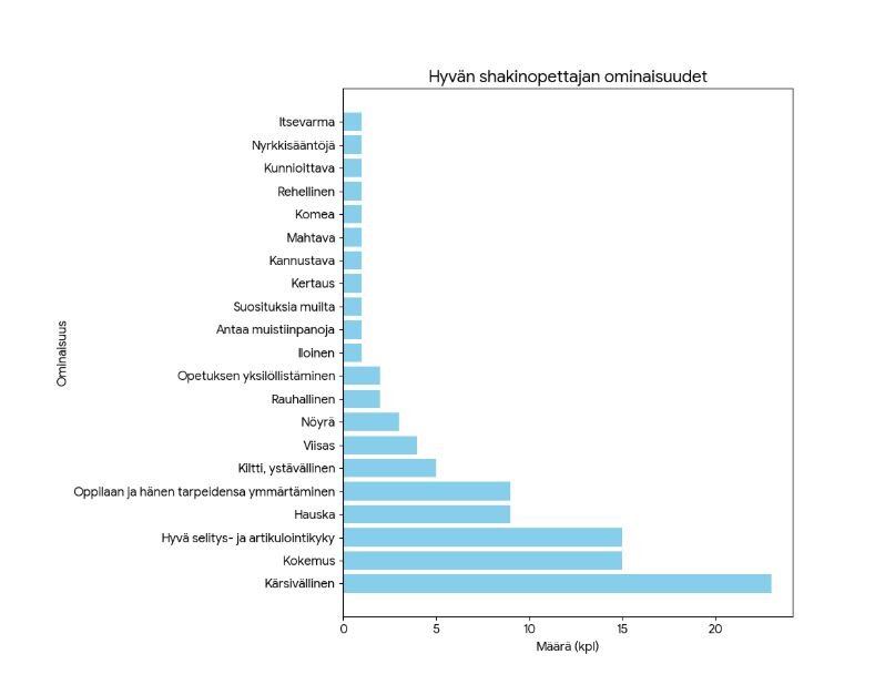 Mutta listan ulkopuolelta löytyi myös paljon muuta tärkeää. Hyvää shakinopettajaa kuvattiin usein iloiseksi, rohkaisevaksi ja positiiviseksi. Myös huumorintaju sai mainintoja, sillä oppiminen ei ole vain faktojen opettelua, vaan myös yhdessä viihtymistä.